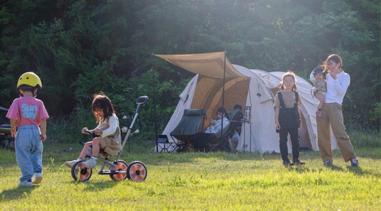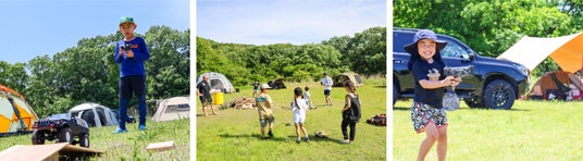 同じキャンプ好きとはいえ今日出会った人ばかりの空間で大人達の交流は少しぎこちない空気感が漂っていた中、子ども達が遊び始め、ラジコンを追いかけたり水鉄砲で撃ち合ったりと気付けば大人も混じって大盛り上がり。