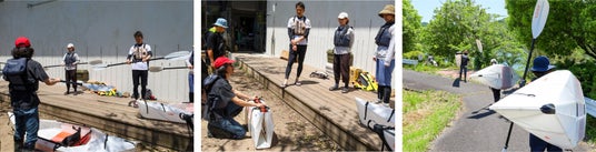 生粋のキャンプ好きで今回自身もテント泊で参加してくださったUPIの井口さんに組み立て方やパドルの漕ぎ方などのレクチャーを受け、いざ入水。