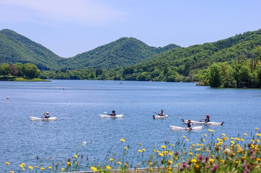 絶景の中風も優しく、湖特有の穏やかな波をかき分けて進む体験には大人もついつい夢中に。水上散歩後は真剣にカヤックの購入を考える姿も。