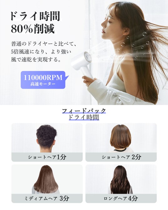 Bopwavy ヘアドライヤーは高速モーターを内蔵し、毎分 110,000 回の高速回転で、大風量で 36 メートル/秒の強風を送り出します。 長い髪を乾かすのにかかる時間はわずか1~8分です.