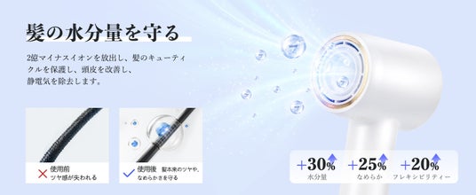 高濃度2億個のマイナスイオンが髪本来のツヤと滑らかさを守ります。 マイナス極を加減して水蒸気を発生させ、髪にしっかり潤いを補給します。 また、髪を乾かす際の静電気の発生も防ぐことができます。 ストランドに負担をかけ、髪を滑らかにします。