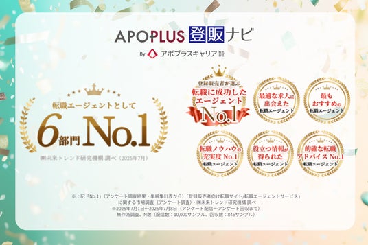 登録販売者・調剤事務などの医療従事者専門キャリア支援サービスを提供するアポプラスキャリア株式会社(本社所在地:東京都千代田区、代表取締役社長:藤本 輝)は、この度、当社が運営する登録販売者向け転職エージェントサービス「アポプラス登販ナビ」にて、株式会社未来トレンド研究機構が実施した市場調査において、6部門でNo.1を獲得したことをお知らせします。