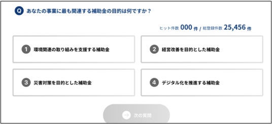 AIが自動的に診断を生成し、利用者は生成される診断に回答していくだけで自社にマッチする補助金を見つけることが可能です。