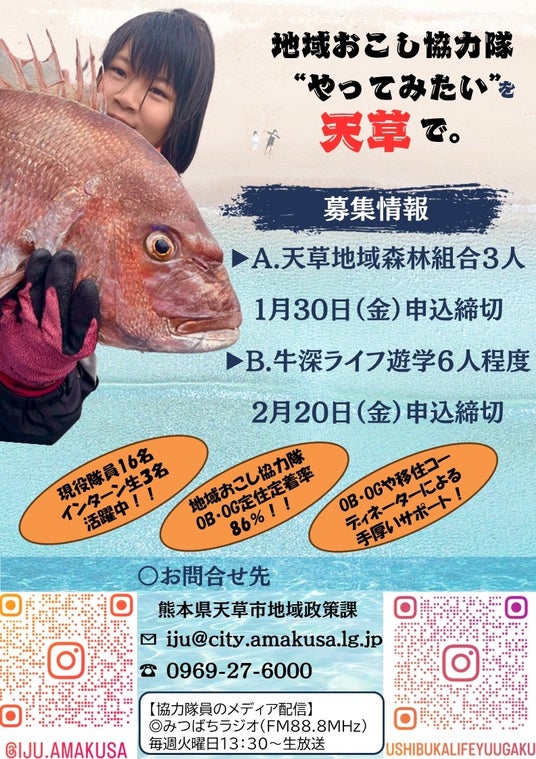 天草市地域おこし協力隊員16人、地域おこし協力隊インターン参加者が3人が地域協力活動をしています。
