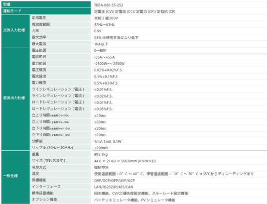 こうしたニーズに応えるために開発されたのが、超小型双方向直流電源「biTRITON TRBAシリーズ」です。単相200V入力に対応し、19インチラック1Uハーフラックサイズ・質量5.1kgというコンパクト設計でありながら、電力回生機能も搭載。従来機の1/10の体積で同等のパワー(2.5kW)のため、小さなスペースでエコな試験を可能にします。
