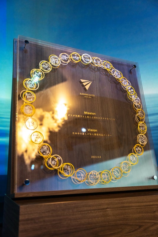 続いて三和物産のメンバー全員の想いが書き込まれたモニュメント「三和の輪」に、自らの想いを書き込むセレモニーが執り行われました。「三和の輪」は、三和物産で働く一人一人の個性がつながることで、一つの大きな力になるという会社の理念を象徴するものです。一人は「太陽のマーク」を。そしてもう一人は「たくさん知る!」と三和の輪に記入。これから仲間と共に成長しながら大きな目標に向かって歩む決意を新たにしました。