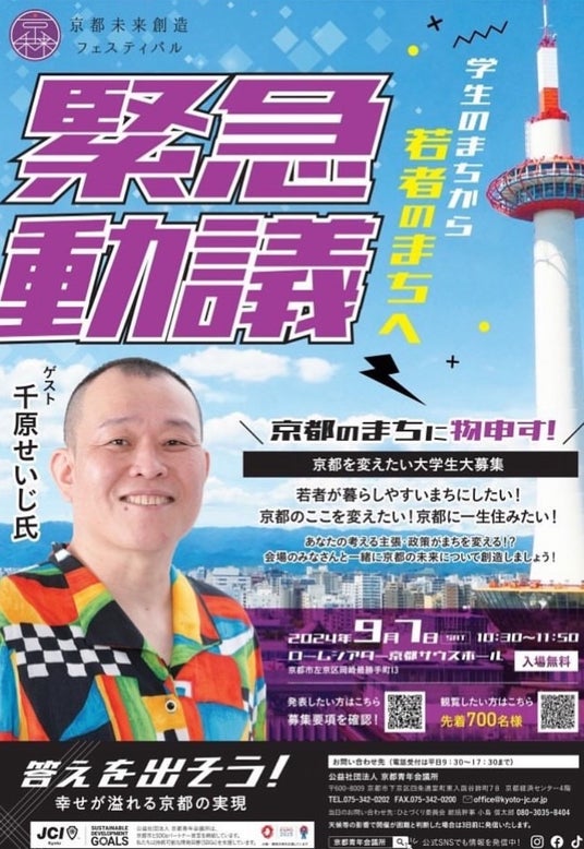 吉本興業の千原せいじ氏をお招きし、若者から京都を盛り上げるべく、大学生の主張「緊急動議~学生のまちから若者のまちへ~」を開催します!