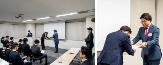 ベルテックス代表取締役梶尾より、新入社員へ辞令を授与