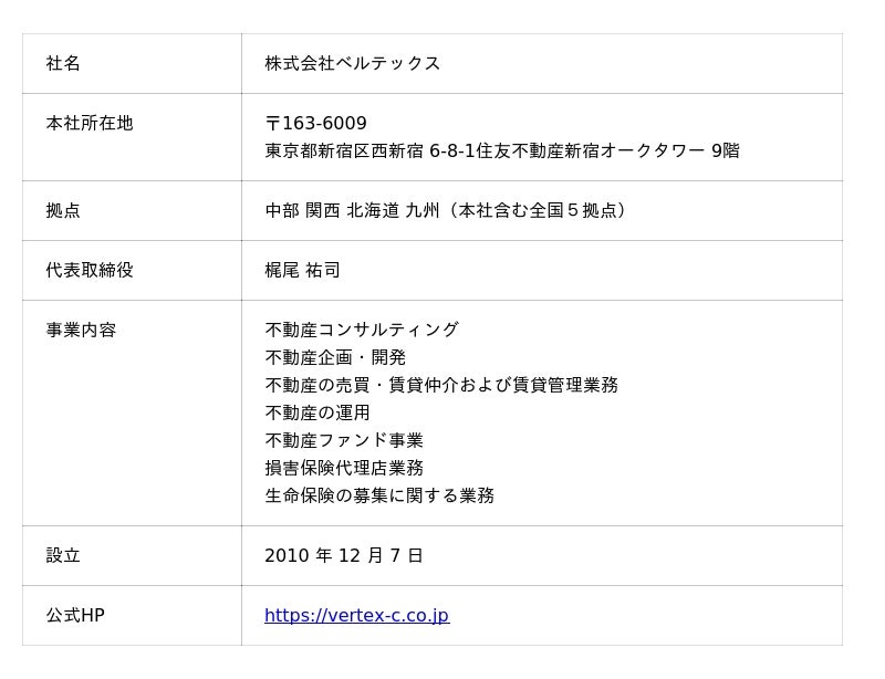ベルテックスは、「より多くの人々の不安を『夢』や『希望』に変える」を企業理念に、不動産投資を通じた資産形成コンサルティングを軸として、不動産の企画・開発、ファンド運営、賃貸管理事業などを展開しています。