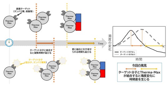 ・創薬ターゲット(核酸等)を固定化したTherma-Maxは温度変化等で凝集して磁石に引き寄せられる(左上図)。 ・更にターゲット分子(低分子やタンパク質ライブラリー)と結合すると磁石に引き寄せられる時間が延びる(左下図)。 ・Therma-Maxの磁気分離の速度差を濁度(吸光度)で測定する事により、創薬ターゲットとターゲット分子の相互作用の有無が簡便に測定できる(右端図)。