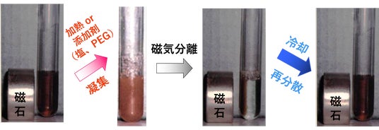 刺激応答性磁性ナノ粒子(Therma-Max、Vira-Max)は水に溶液状態で分散しているため磁石による磁気分離は困難であるが(左端図)、加熱(30℃以上)もしくは添加剤(硫酸ナトリウム、塩化ナトリウム、PEG等)により凝集する(中央左図)。凝集体は磁石による迅速な磁気分離が可能であり(中央右図)、冷却操作により再分散する(右端図)。