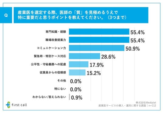 さらに、「産業医を選定する際、医師の『質』を見極めるうえで特に重要だと思うポイント」について調査したところ、「専門知識・経験」が55.4%、「職場改善提案力」が55.4%、「コミュニケーション力」が50.9%となりました。