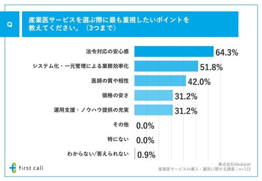 最後に、「産業医サービスを選ぶ際に最も重視したいポイント」について調査したところ、「法令対応の安心感」が64.3%、「システム化・一元管理による業務効率化」が51.8%、「医師の質や相性」が42.0%となりました。