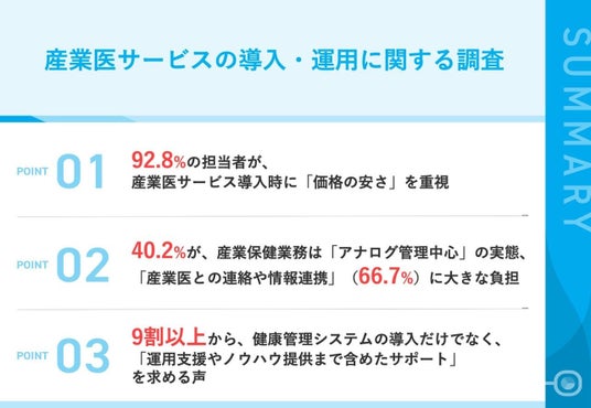 今回の調査から、企業が産業医サービスを導入する際には「価格」や「法令対応」をまず重視するものの、運用フェーズに入ってから業務効率化や情報一元管理、専門ノウハウなどのサポート不足に直面している状況がうかがえました。