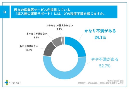 また、「現在の産業医サービスが提供している『導入後の運用サポート』にどの程度不満を感じるか」について調査したところ、「かなり不満がある」が24.1%、「やや不満がある」が52.7%となりました。