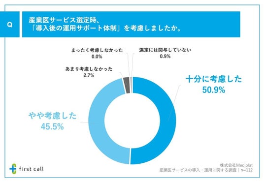 加えて、「産業医サービス選定時、『導入後の運用サポート体制』を考慮したか」について調査したところ、「十分に考慮した」が50.9%、「やや考慮した」が45.5%となりました。