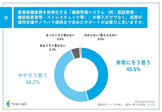 加えて、「産業保健業務を効率化する『健康管理システム』の導入だけでなく、実際の運用支援やノウハウ提供まで含めたサポートが必要だと思うか」について調査したところ、「非常にそう思う」が45.5%、「ややそう思う」が48.2%となりました。