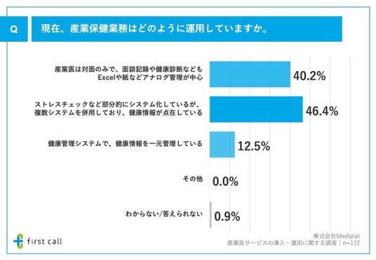 次に、「産業保健業務の運用」について調査したところ、「産業医は対面のみで、面談記録や健康診断などもExcelや紙などアナログ管理が中心」が40.2%、「ストレスチェックなど部分的にシステム化しているが、複数システムを併用しており、健康情報が点在している」が46.4%、「健康管理システムで、健康情報を一元管理している」が12.5%となりました。