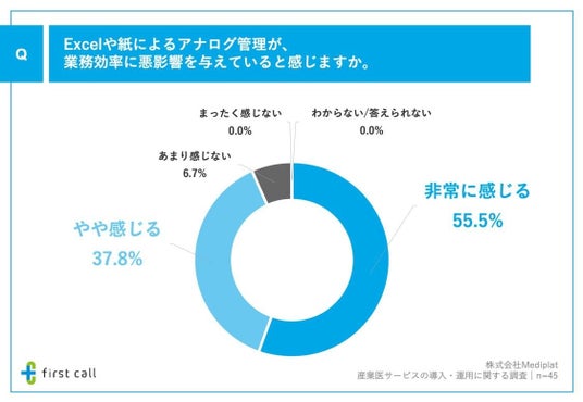 また、前問で「Excelや紙などアナログ管理が中心」と回答した方に、「Excelや紙によるアナログ管理が、業務効率に悪影響を与えていると感じるか」について調査したところ、「非常に感じる」が55.5%、「やや感じる」が37.8%となりました。