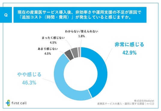 続いて、「現在の産業医サービス導入後、非効率さや運用支援の不足が原因で『追加コスト(時間・費用)』が発生していると感じるか」について調査したところ、「非常に感じる」が42.9%、「やや感じる」が46.3%となりました。