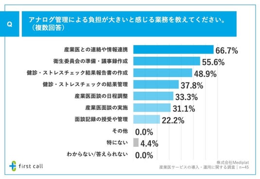加えて、前問で「Excelや紙などアナログ管理が中心」と回答した方に、「アナログ管理による負担が大きいと感じる業務」について調査したところ、「産業医との連絡や情報連携」が66.7%、「衛生委員会の準備・議事録作成」が55.6%、「健診・ストレスチェック結果報告書の作成」が48.9%となりました。
