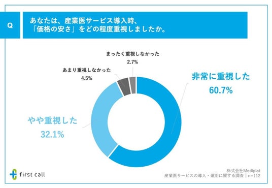 はじめに、「産業医サービス導入時、『価格の安さ』をどの程度重視したか」について調査したところ、「非常に重視した」が60.7%、「やや重視した」が32.1%となりました。