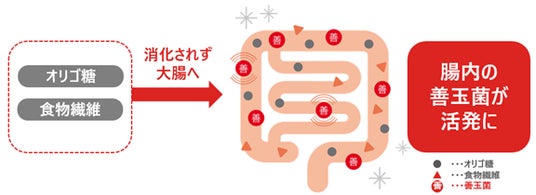 腸の中には「善玉菌」のほか、「大腸菌」などのさまざまな細菌が棲んでいます。このバランス(腸内細菌叢=腸内フローラ)が崩れると、便質や腸の健康に影響を与える原因になります。「プレバイオティクス」は善玉菌のエサになり、腸内細菌叢(腸内フローラ)を整えることにつながります。