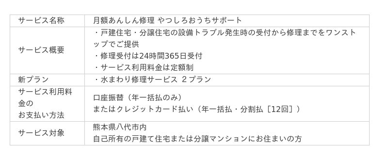その取り組みの一環として八代市で地域の皆さまへお届けしている、水まわり修理に特化した「月額あんしん修理 やつしろおうちサポート」(本サービス)を、皆さまの暮らしに合わせてお選びいただけるよう、ご要望にお応えし2つのプランへとリニューアルし、本年4月1日より提供を開始いたします。