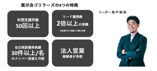「展示会ゴリラーズ」は、このような展示会当日に社員の稼働人数が増やせない中でも成果を出したい企業に対して、リードや商談獲得に特化した最適な営業人員のアサインを行うことが可能になります。