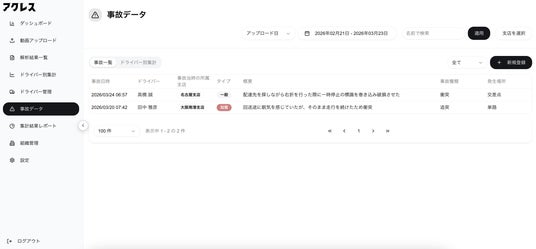 ティーティス合同会社(本社:東京都渋谷区、CEO:高頭 博志、以下「ティーティス」)は、AIを活用した車両事故防止サービス『アクレス』に、事故データ管理・分析機能を新たに搭載したことをお知らせいたします。本機能により、従来Excelや紙、担当者のPCのフォルダで管理されていた事故情報をアクレス上で一元管理し、ドライバーごとの事故分析・安全改善施策の立案をシームレスに行えるようになります。