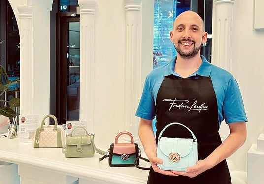 デザイナー、フレデリック・レセリエ。ブルーのボーモント・バッグとコレクションの他のアイテムと共に。