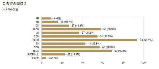 次に希望される間取については2LDKが最も高く全体の63.1%で次いで3LDKが46.3%という回答を得ている(図9参照)。