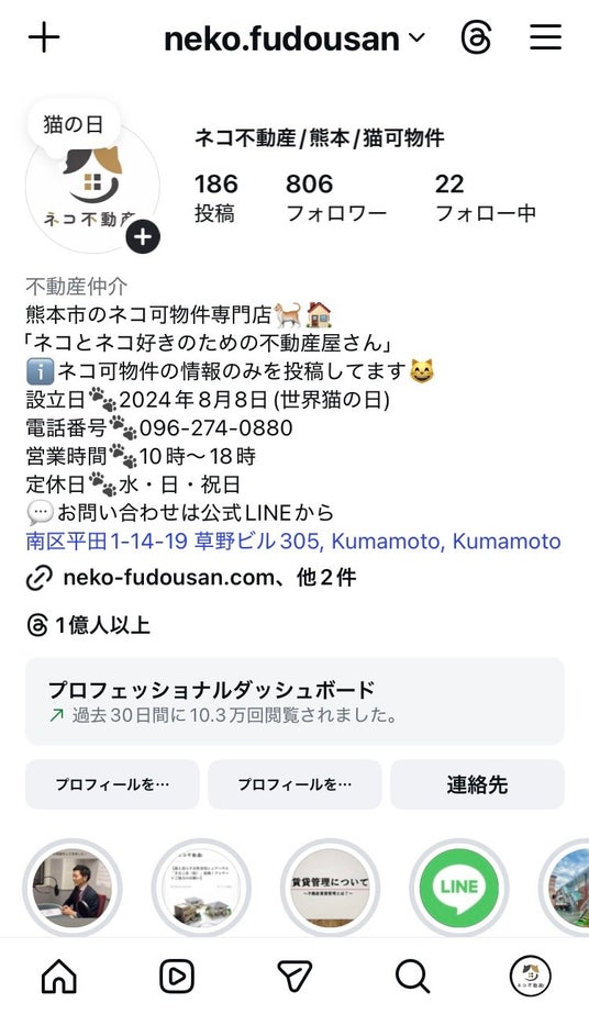 また、ネコ不動産のインスタは熊本県内のネコ可物件のみを投稿しているが、広告なしで1ヶ月に10万閲覧を超えておりネコ可物件の需要の高さがうかがえる(図5)。