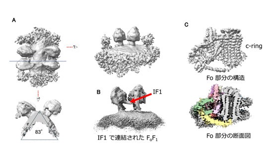 図2 (A)FoF1 の四量体構造 横から見ると83°膜を湾曲させていることがわかる。(B) FoF1 の二量体構造。(C) Fo 部分の構造。断面図をみると c-ring 内部がほぼ中空であり、固定化された脂質は確認されない。