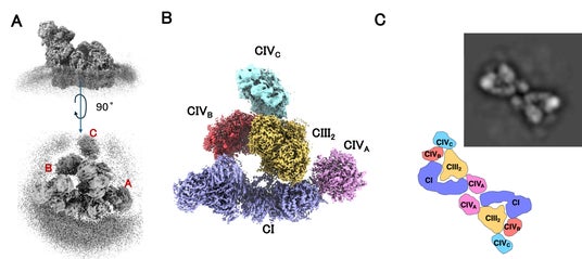 図3. (A) SMP上で新たに同定された呼吸鎖複合体からなる超分子構造。(B) CI とCIIIの二量体構造に加えて、3つのCIVが結合している。(C) 2D 像から同定されたメガ複合体(CI2CIII2CIV₆)