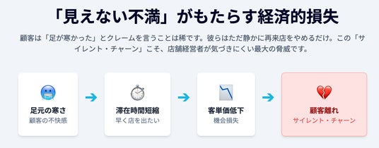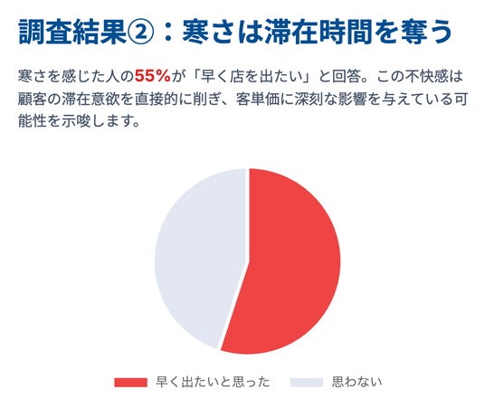 空調が効いた店内でも、暖かい空気は上に滞留し、足元は冷えるという構造的課題があります。今回の調査からは、店舗側が気づきにくい“サイレントな不満”が、経営上の重大な機会損失を生んでいる実態が浮かび上がりました。