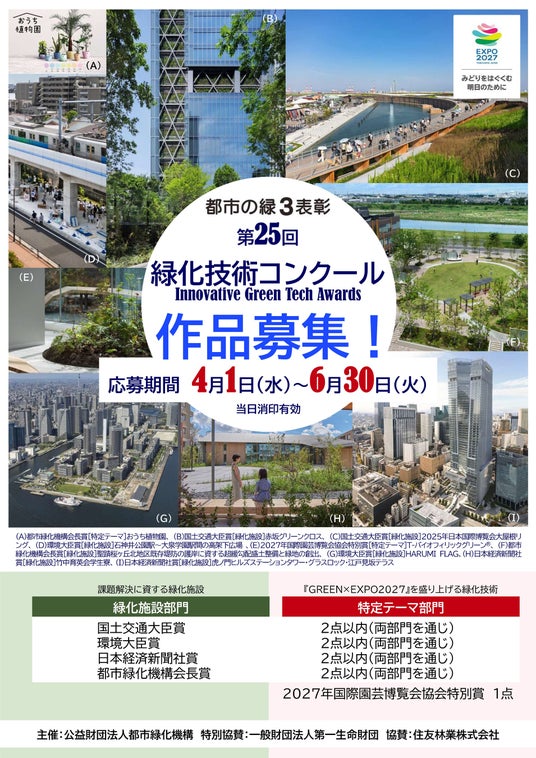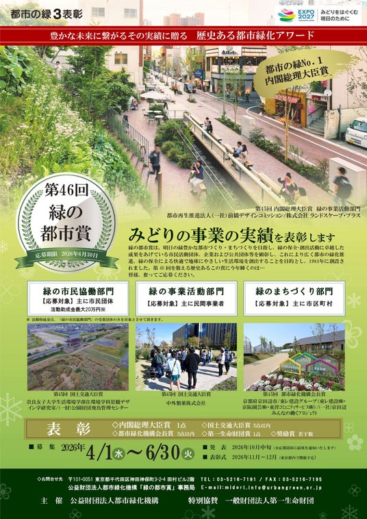 2026年4月1日より6月30日まで、「都市の緑3表彰」について募集いたします。全国の市民団体、事業者、行政等、多くの皆様から各賞へのご応募をお待ちしております。