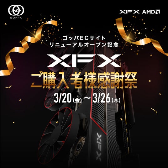 ゴッパ公式ECサイトのリニューアルオープンを記念し、最新GPUの特別価格での販売や豪華景品が当たる抽選企画などを実施する「XFX ご購入者様感謝祭(仮)」を、2026年3月20日より開催