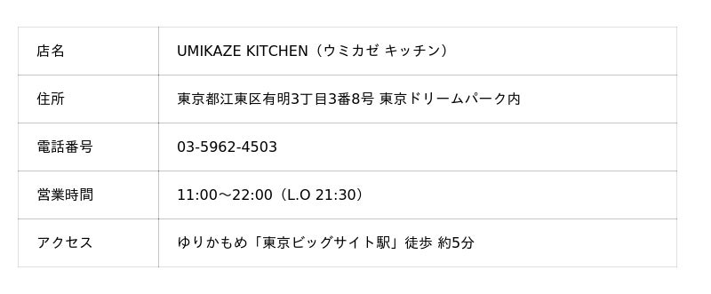 「UMIKAZE KITCHEN」は、“ちょっと良い日常”をコンセプトに、家庭で馴染みのある料理を気軽に愉しめるコンフォートファミリーダイニングです。大人から子どもまで、それぞれの「好き」が一つのテーブルに集い、自然と会話が生まれる、心地よい食の時間を提供します。また、東京ドリームパークにおけるメインダイニングとして、施設内でさまざまなエンタテインメント体験を満喫した後も、“食”を通じてその余韻を楽しめる場として位置付けています。