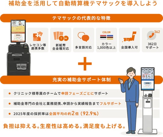 株式会社カワニシバークメド(本社:岡山県岡山市、代表取締役:本山章)は、クリニック向け自動精算機「テマサック」の導入に関して、2025年度IT導入補助金(インボイス枠・インボイス対応類型)において、92.9%という極めて高い採択率(全国平均46.2%)を達成しました。