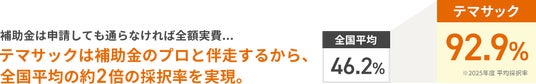当社は補助金・助成金に特化した専門のコンサルティング会社と提携することで、2025年度は全国平均46.2%に対し、92.9%という突出した採択率を実現しました。また直近3年の平均採択率でも91.1%と安定した実績を残しています。