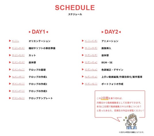 講座は2日間で動画編集ができるようになる実践的なカリキュラム内容です。最後には、受講者の実績となるポートフォリオとして自己紹介動画を作成するので、月曜日から営業活動を始められます。