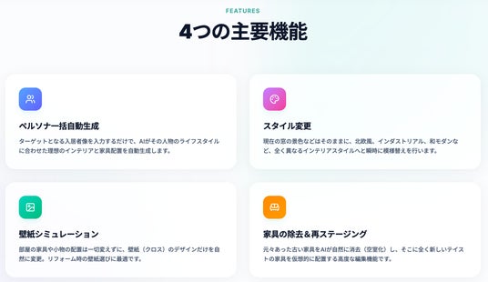 従来のバーチャルステージングと異なり、ペルソナ設定から空間デザインまでを一括で自動生成できる点が特徴です。