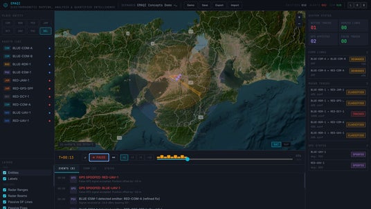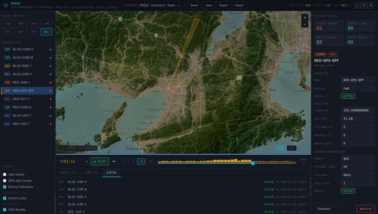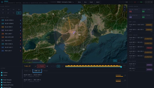 EMAQIは、高解像度の衛星画像を背景とした2Dマップ上に、通信ノード、レーダー、センサー、ジャマー、デコイ、UAVなどの各種アセットを配置し、それらの相互作用を時間軸とともに観察・比較できるプラットフォームです。通信妨害、レーダー探知・追尾、受動探知、GPS妨害・欺瞞といった、従来は個別に理解されることの多かった要素を、単一の画面上で関連づけて把握できる点を特長としています。