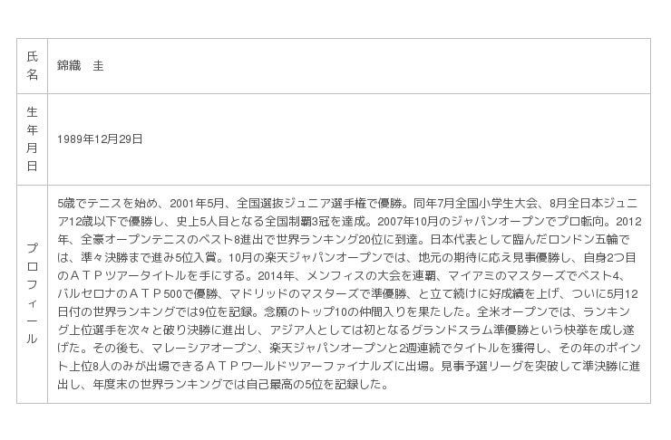 参考:錦織圭さんプロフィール