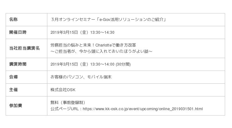 2019年3月15日(金)に開催される株式会社OSK様(本社:東京都墨田区、代表取締役社長:宇佐美 愼治)主催の3月オンラインセミナー「e-Gov活用ソリューションのご紹介」で、株式会社ユー・エス・イー(本社:東京都渋谷区恵比寿、代表取締役社長 吉弘文平)の社員がセッションに参加し講演を行います。直接、社会保険手続きに課題をお持ちの労務担当者様より生の声を聞いている担当者が、課題の解決事例などに触れながら、これから求められる働き方の一つの姿をご提案いたします!