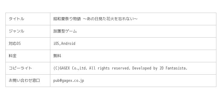 株式会社GAGEX(ガジェックス)(本社:東京都墨田区、代表取締役:井村 剣介)は、スマートフォン向けアプリ「昭和夏祭り物語 ~あの日見た花火を忘れない~」のサービスを開始いたしました。