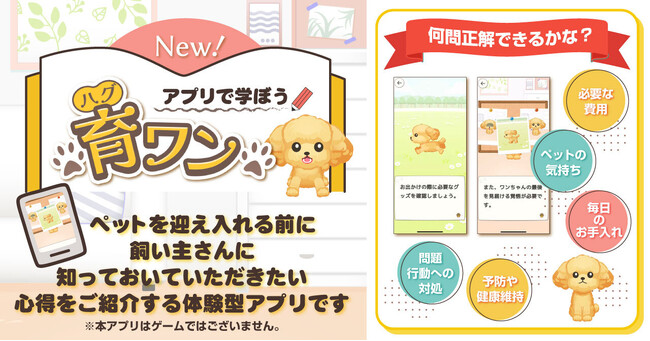 アプリ内ではワンちゃんの飼育を始める前の心構えや、信頼できるペットショップの選び方、お迎え後の具体的なお世話の仕方を体験可能で、これから新しい家族と新しい暮らしを始めるにあたって必要となることを学べます。