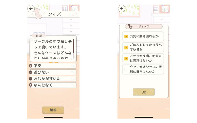 アプリを進めていくとワンちゃんとの暮らしに関わるクイズやチェック項目を入力する場面があり、考えながら使用することでさらに理解を深めていただけます。