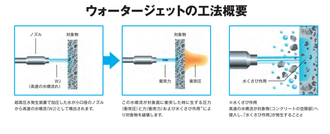 超高圧水を小口径のノズルから噴射し、対象物を破壊するウォータージェット工法はマイクロクラックがほとんど発生せず、鉄筋を傷つけないことから構造物への影響、騒音が少ない為、道路や橋脚等の社会インフラの維持補修工事において多くの現場で用いられる工法です。